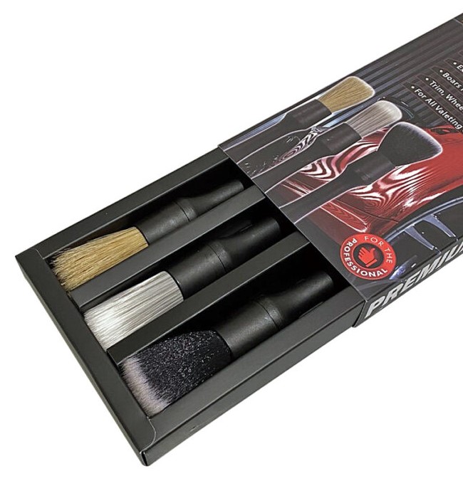 Premium detailing brushes come as a pack of three brushes with various bristle styles for each brush. These premium detailing brushes are for multi-purpose use throughout all automotive detailing tasks. Resistant to most detailing chemicals for long term durability.